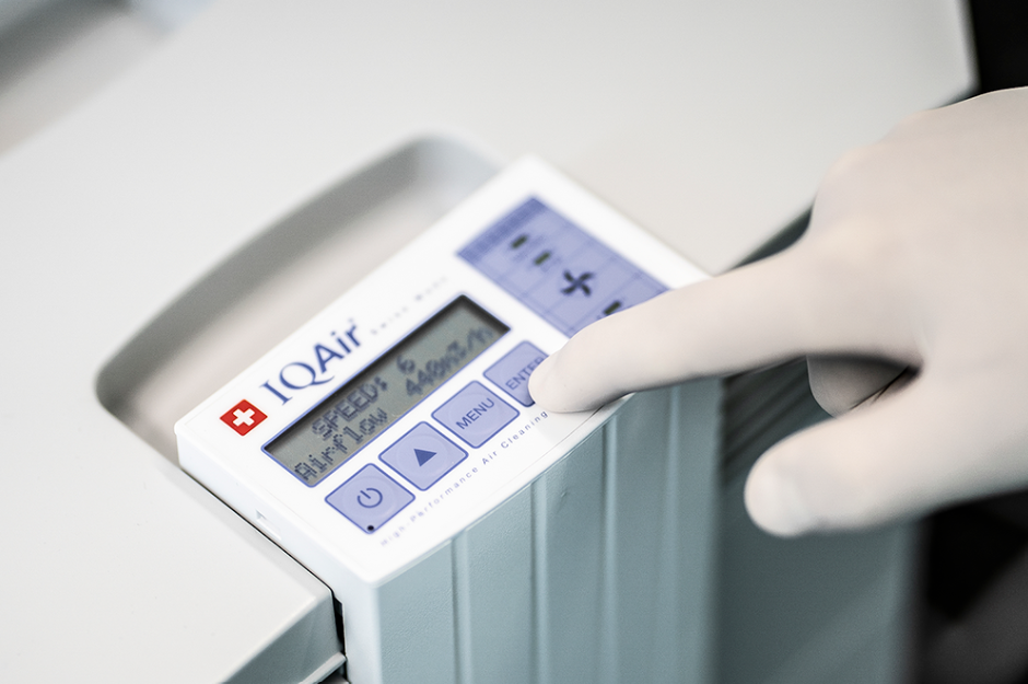 Chaque pièce est régulièrement ventilée et nous utilisons des assainisseurs d'air désinfectants entre les rendez-vous pour purifier et désinfecter l'air. Nous avons plusieurs filtres HEPA suisses de qualité hospitalière pour filtrer l'air à la réception et dans les salles de traitement. Les filtres de circulation d'air et de climatisation sont renouvelés et désinfectés régulièrement.